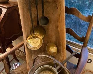 You’ll also find a collection of Staffordshire dogs and other figural pieces, a large collection of snuff boxes, a small tantalus, and a large collection of tole trays and papier-mâché trays, along with drop-leaf tables, tilt-top tables, and candle stands. There is a great collection of brass buckets, sets of Hitchcock chairs, and large, medium, and small Oriental rugs.